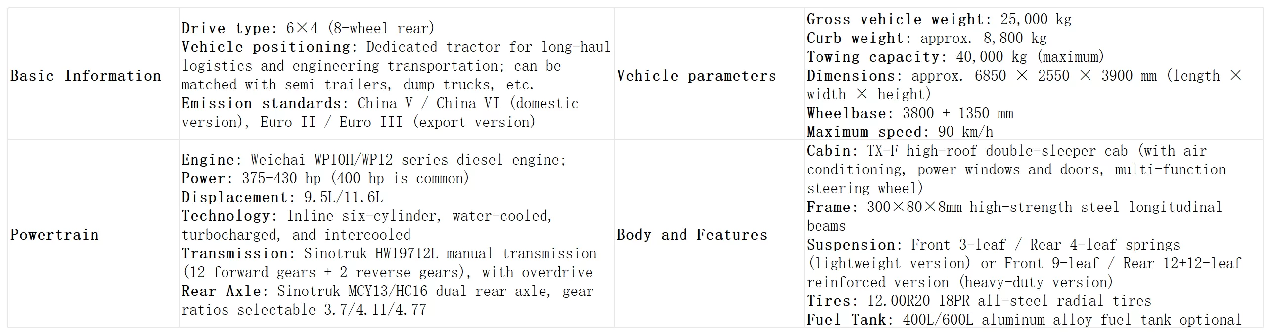Los parámetros principales de este camión tractor Sinotruk Howo TX 6×4 (versión con chasis) son los siguientes::